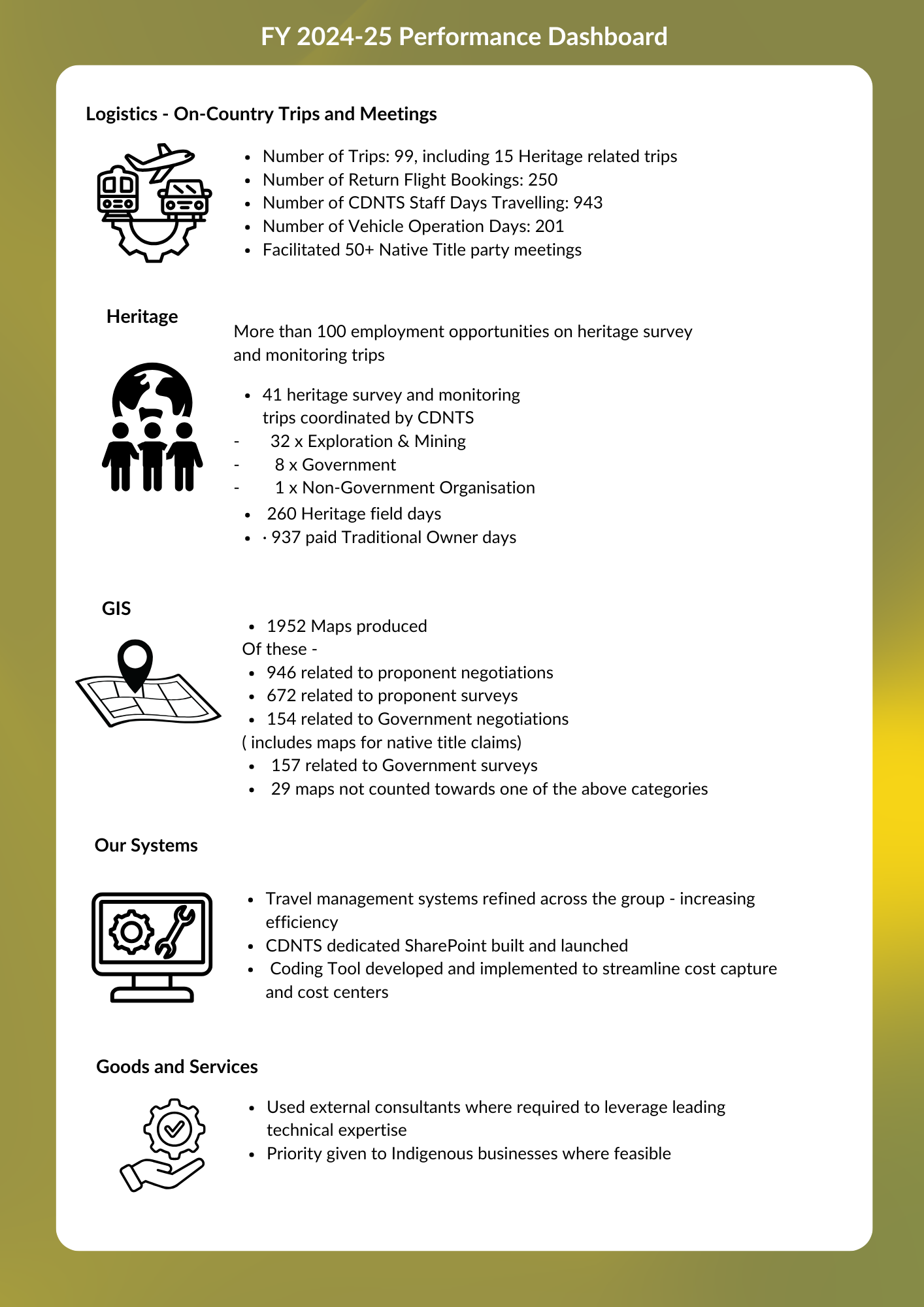 Heritage coordination work for surveys and GIS (mapping) saw a large jump in number. Survey work averaged one survey per week (40-week field season) up from 20 surveys last FY. This survey number does not reflect the true number of surveys in the entire rep area, only those coordinated by CDNTS. The increase in number is driven by agreements and future acts which have also increased in number over the year.